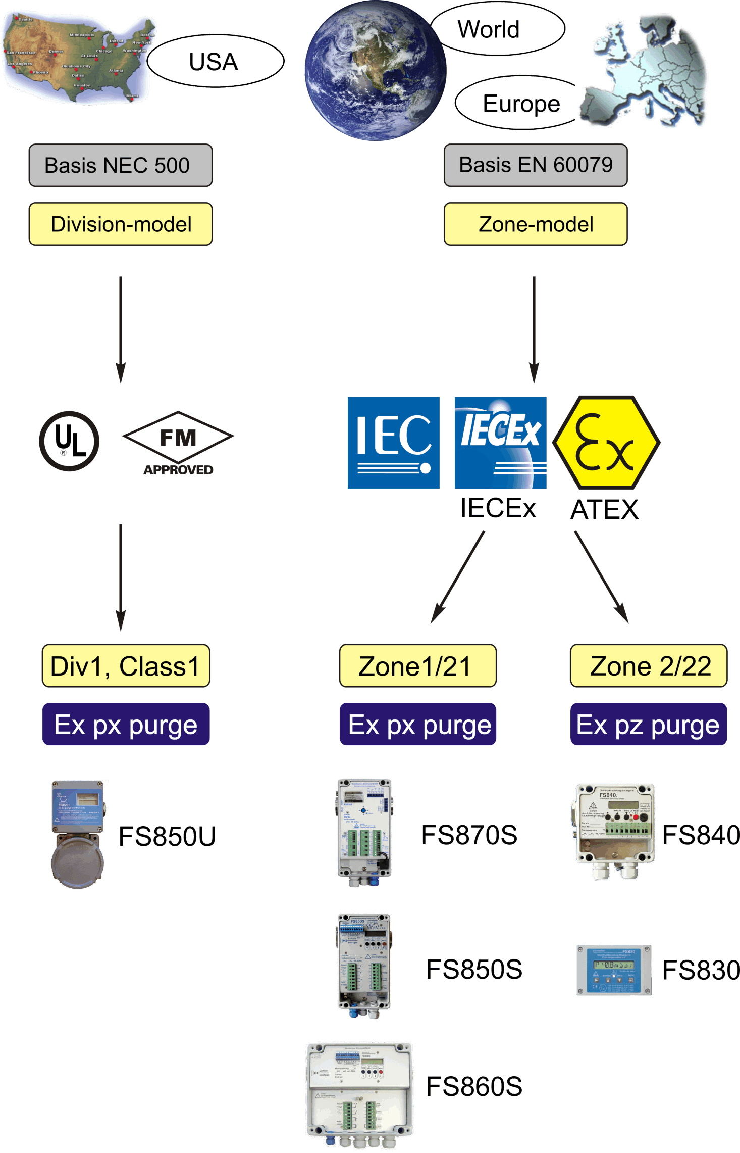 Dies wird dadurch erreicht, indem das Gerät in einem überdruckgekapselten Gehäuse (Ex p-Gehäuse) betrieben wird, und dieses Ex p-Gehäuse durch ständigen geringem Überdruck mit Luft oder einem Inertgas, vor dem Eindringen explosiver Gasgemische geschützt ist.